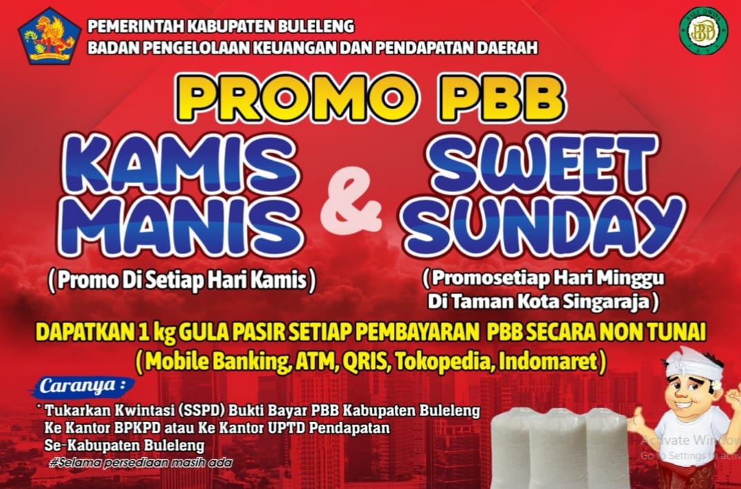 ebyar Kamis Manis Semanis Senyuman #SemetonBuleleng yang dilaksanakan pada hari Kamis, 16 Pebruari 2023 untuk seluruh wajib pajak yang membayar pajak PBB-P2 dengan menggunakan kan digital (QRIS, M-Banking, Virtual Account, Indomaret, Tokopedia dan ATM) berkesempatan memperoleh "GULA PASIR 1 (satu) Kg" dari pukul 08.00 s/d 14.00.