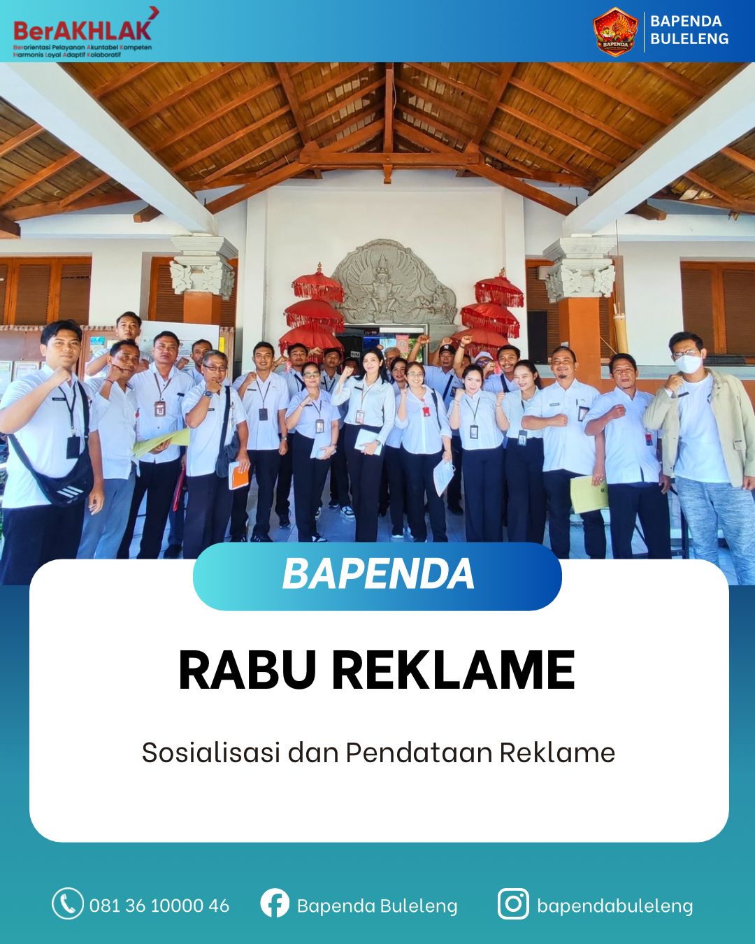 Kepala Badan Pendapatan Daerah Kabupaten Buleleng menyampaikan bahwa kegiatan Rabu Reklame dilaksanakan secara rutin setiap hari Rabu sebagai bentuk komitmen Bapenda dalam meningkatkan kepatuhan wajib pajak reklame sekaligus mengoptimalkan Pendapatan Asli Daerah (PAD).