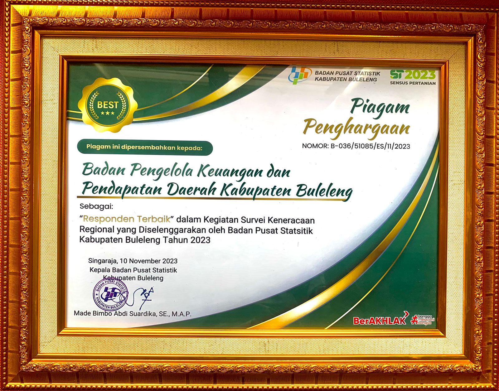 Badan Pengelolaan Keuangan dan Pendapatan daerah Kab. Buleleng raih Penghargaan sebagai ‘’Responden Terbaik’’ dalam kegiatan Survei Keneracaan Regional yang diselenggarakan oleh Badan Pusat Statistik Kab.Buleleng tahun 2023.