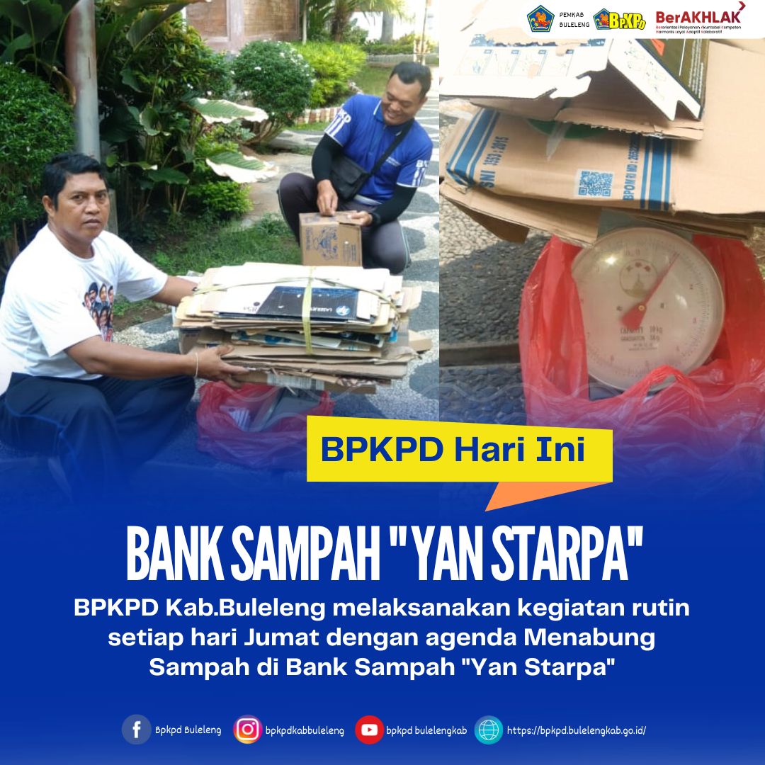 Badan Pengelolaan Keuangan dan Pendapatan Daerah Kab.Buleleng melaksanakan kegiatan rutin setiap hari Jumat dengan agenda Menabung Sampah di Bank Sampah "Yan Starpa'' yang ditimbang oleh petugas. Kegiatan tersebut dilakukan agar lingkungan bersih dan nyaman sehingga meningkatkan kenyaman dalam bekerja.