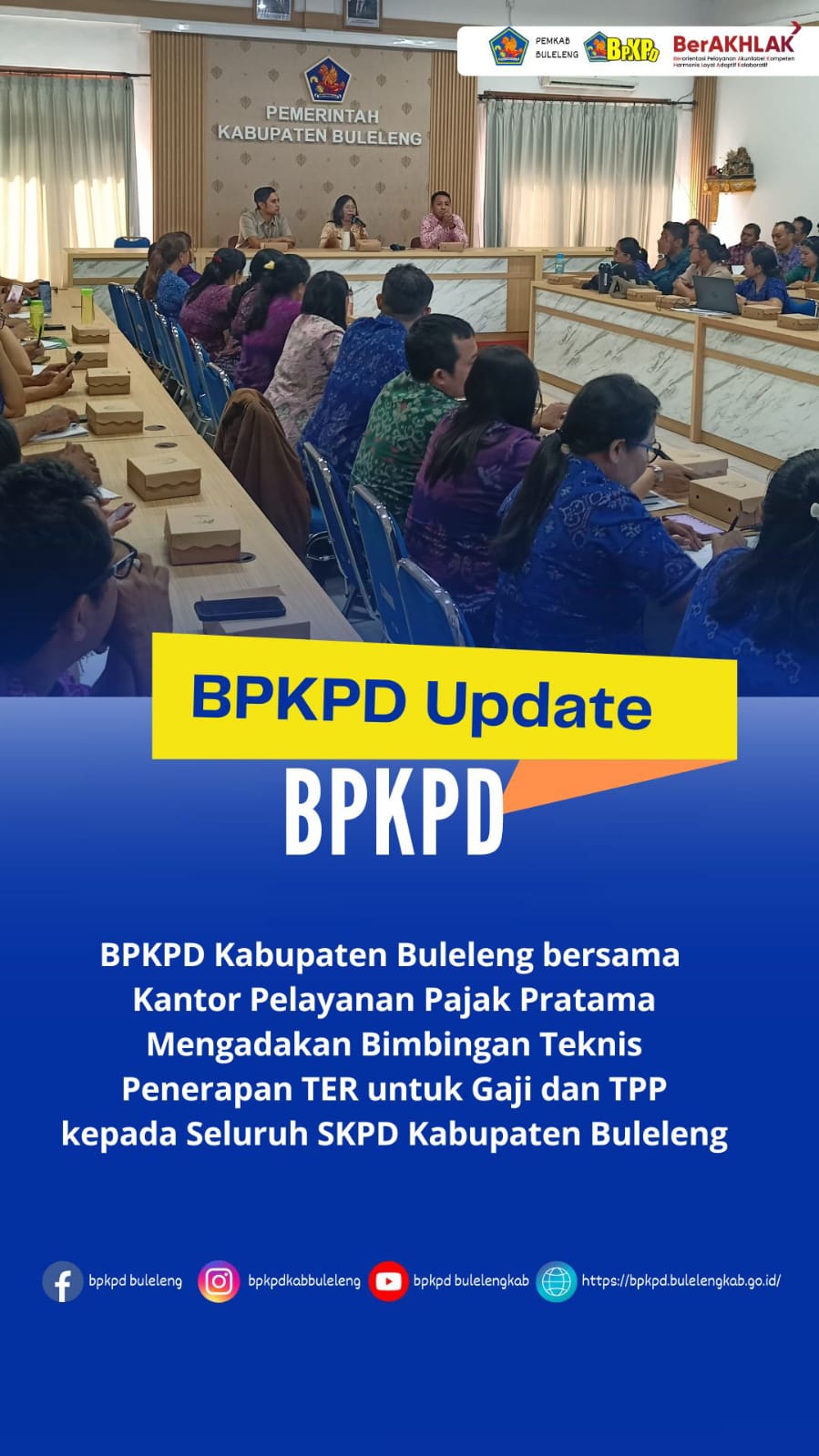 Diadakannya Bimbingan Teknis terkait penerapan TER Gaji dan TPP dalam perhitungan, pemotongan dan pelaporannya melalui aplikasi CORETAX kepada seluruh SKPD Kab.Buleleng, Acara dipimpin oleh Kepala Bidang Perbendaharaan Luh Sri Mendriadi didampingi oleh Narasumber dari Kantor Pajak Pratama Singaraja diikuti oleh seluruh bendahara pengeluaran dan operator pajak pada masing-masing SKPD di Kabupaten Buleleng pada hari Selasa, 6 Mei 2025 bertempat di Ruang Rapat BPKPD Kab.Buleleng.