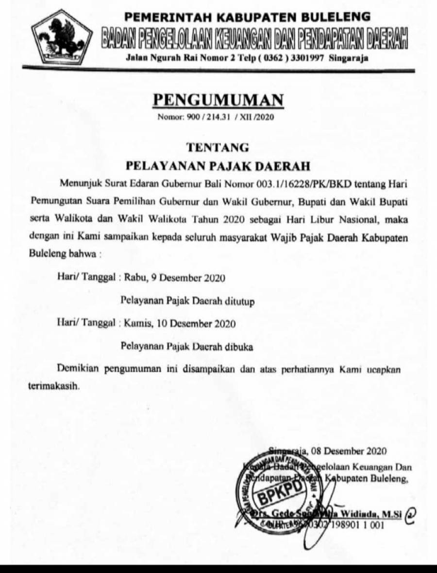 Menunjuk surat edaran Gubernur Bali Nomor 003.1/16228/PK/BKD tentang Hari Pemungutan Suara Pemilihan Gubernur dan Wakil Gubernur, Bupati dan Wakil Bupati, Walikota dan Wakil Walikota Tahun 2020 sebagai Hari Libur Nasional  pada Hari Rabu, 09 Desember 2020.
