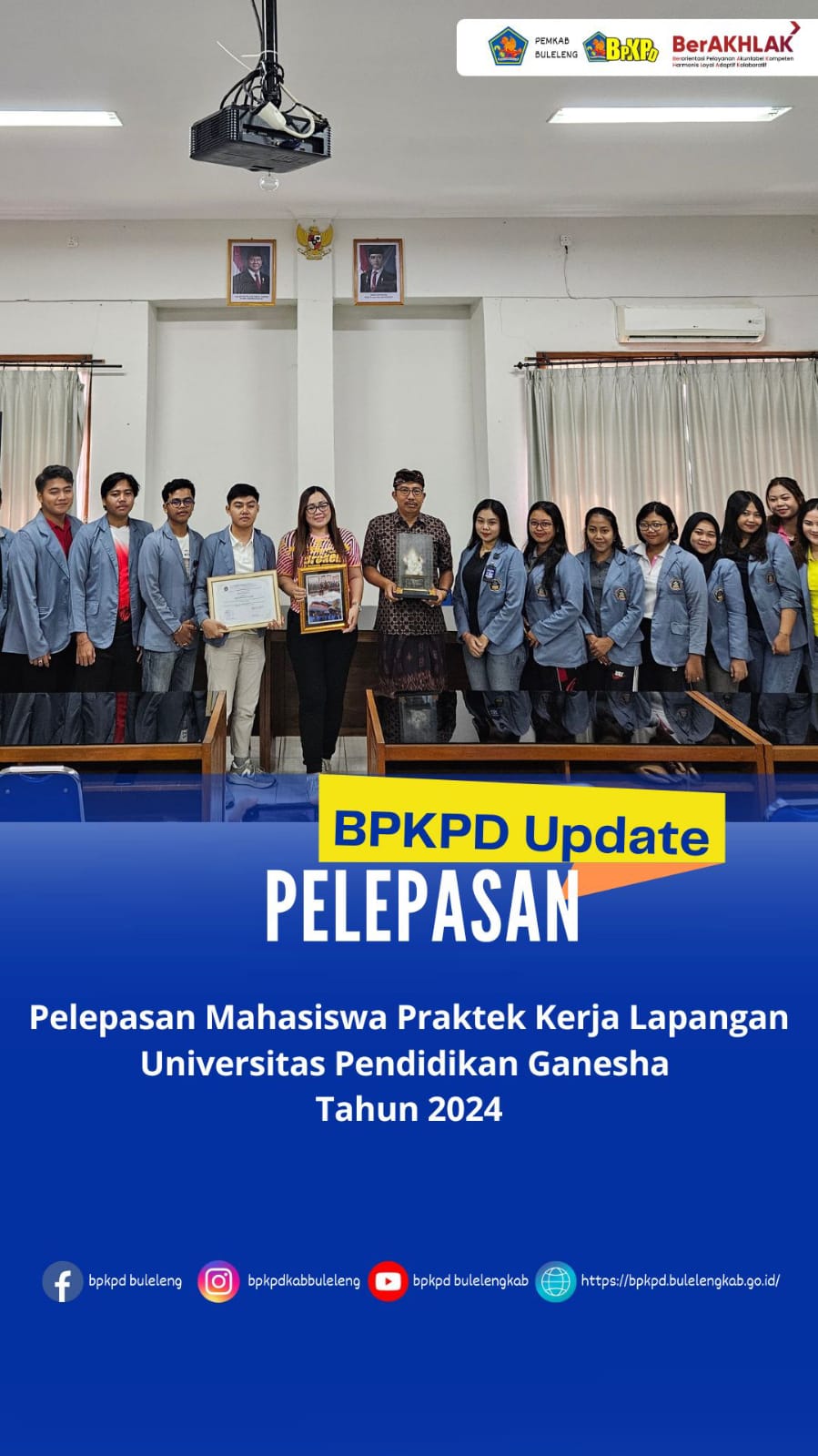 Badan Pengelolaan Keuangan dan Pendapatan Daerah Kab.Buleleng melepas mahasiswa magang dari Universitas Pendidikan Ganesha (Undiksha). Sebanyak 22 mahasiswa telah menyelesaikan masa Praktek Kerja Lapangan mereka selama empat bulan, dari 26 Agustus hingga 20 Desember 2024.