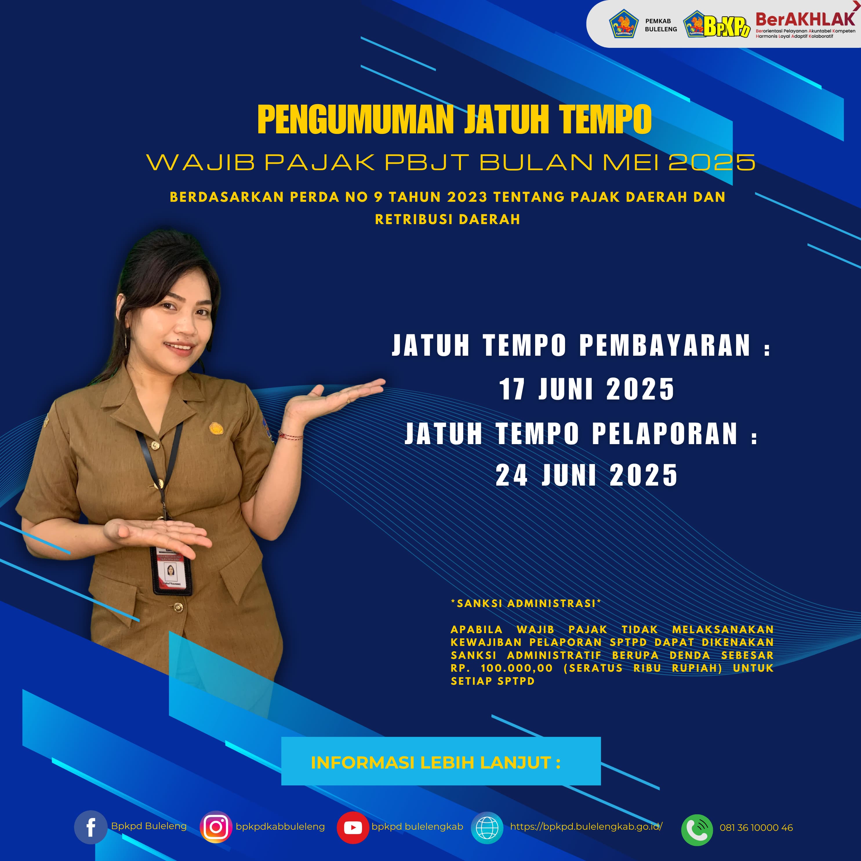 Pengumuman untuk Tanggal ''JATUH TEMPO'' untuk Bulan Mei Tahun 2025, tentang Wajib Pajak PBJT...