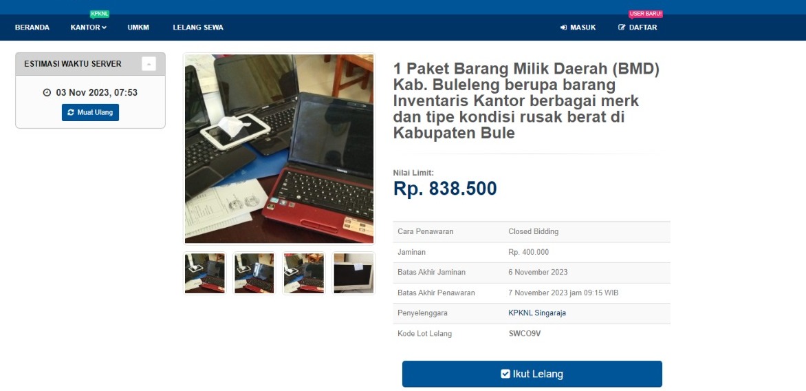 Pemerintah Kabupaten Buleleng melalui perantara Kantor Pelayanan Kekayaan Negara dan Lelang (KPKNL) Singaraja melelang 4 (Empat) Paket barang milik daerah dalam kondisi apa adanya pada tanggal 3 November 2023 Secara online. Bagi masyarakat yang ingin mengikuti lelang bisa mendaftarkan langsung pada alamat domain lelang.go.id.