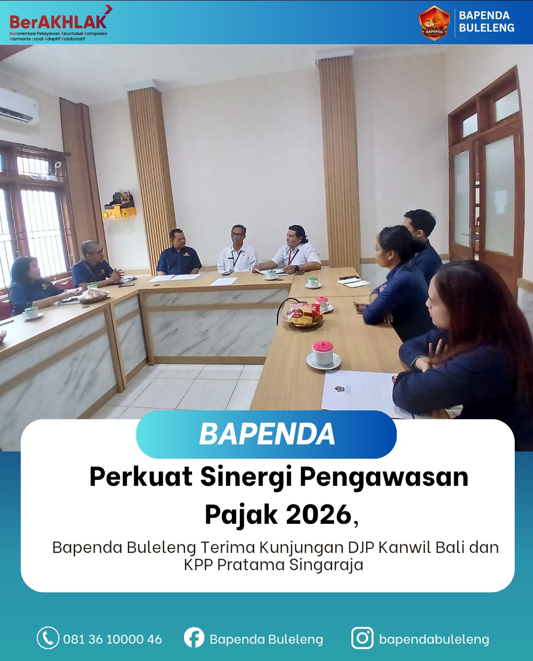 Badan Pendapatan Daerah (Bapenda) Kabupaten Buleleng menerima kunjungan dari Direktorat Jenderal Pajak (DJP) Kanwil Bali dan KPP Pratama Singaraja dalam rangka koordinasi Data ILAP dan Daftar Sasaran Pengawasan Bersama (DSPB) Tahun 2026. Kegiatan berlangsung di Ruang Rapat Mini Bapenda Buleleng, Selasa (25/2).