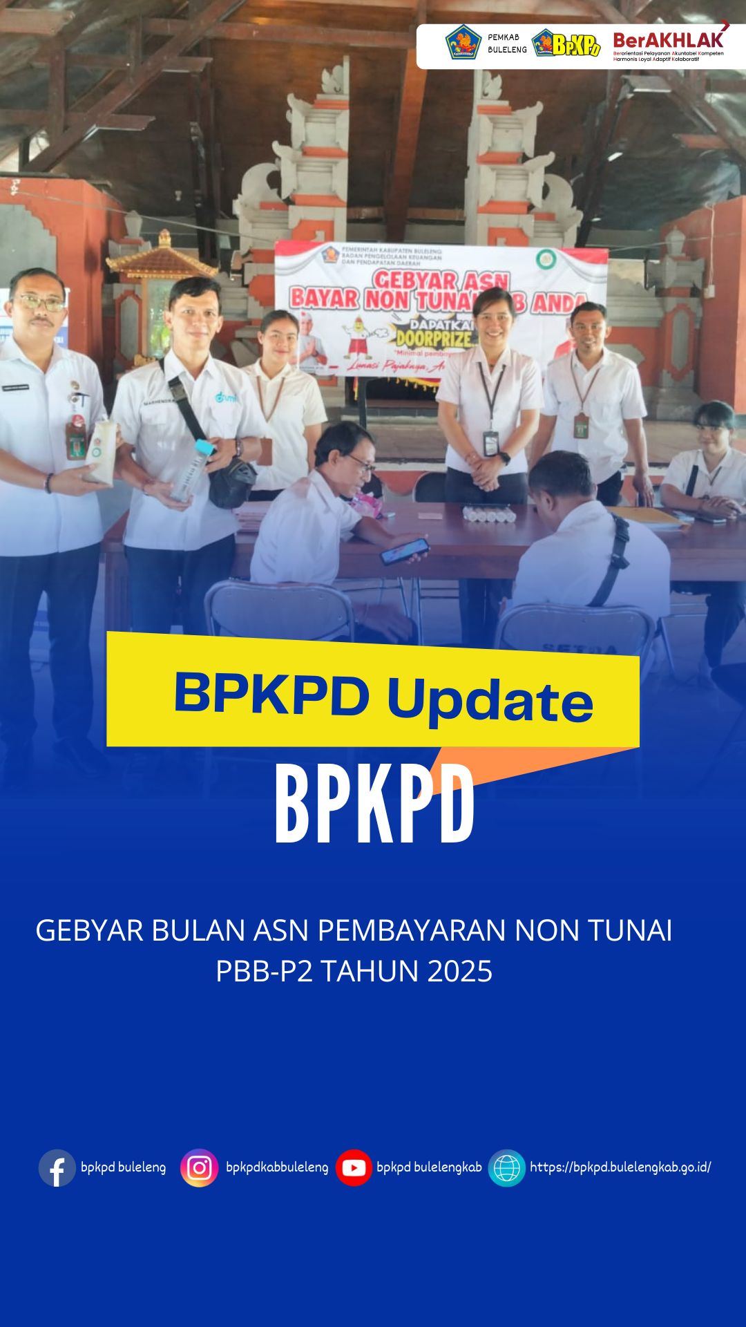 Untuk seluruh ASN Kab.Buleleng Dalam rangka Gebyar Bulan ASN, diinformasikan Kepada Seluruh ASN wajib membayarkan pajak PBB-P2 dengan menggunakan kanal digital (QRIS, M-Banking, Virtual Account, Indomaret, Tokopedia, Gopay dan ATM BPD atau BCA) Semeton berkesempatan memperoleh "Doorprize" diantaranya :