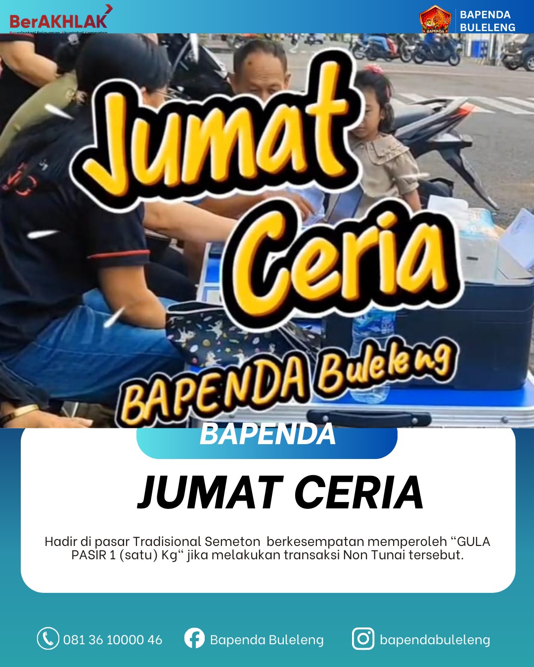 Dalam upaya mendorong percepatan digitalisasi pajak daerah, Pemerintah Kabupaten Buleleng melalui Badan Pendapatan Daerah Kabupaten Buleleng kembali menggelar program unggulan Jumat Ceria 2026. Kegiatan ini dilaksanakan pada hari Jumat di tiga titik strategis pusat aktivitas masyarakat, yakni Pasar Anyar Singaraja, Pasar Seririt, dan Pasar Sangsit.