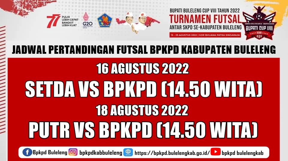 Dalam rangka meramaikan hari kemerdekaan RI ke- 77, kami BPKPD Kab.Buleleng mengikuti TURNAMEN FUTSAL Antar SKPD SE-Kabupaten Buleleng yang diselenggarakan oleh Pemerintah Kabupaten Buleleng pada tanggal 16 dan 18 A gustus 2022, dengan serangkaian jadwal pertandingan sebagai berikut :