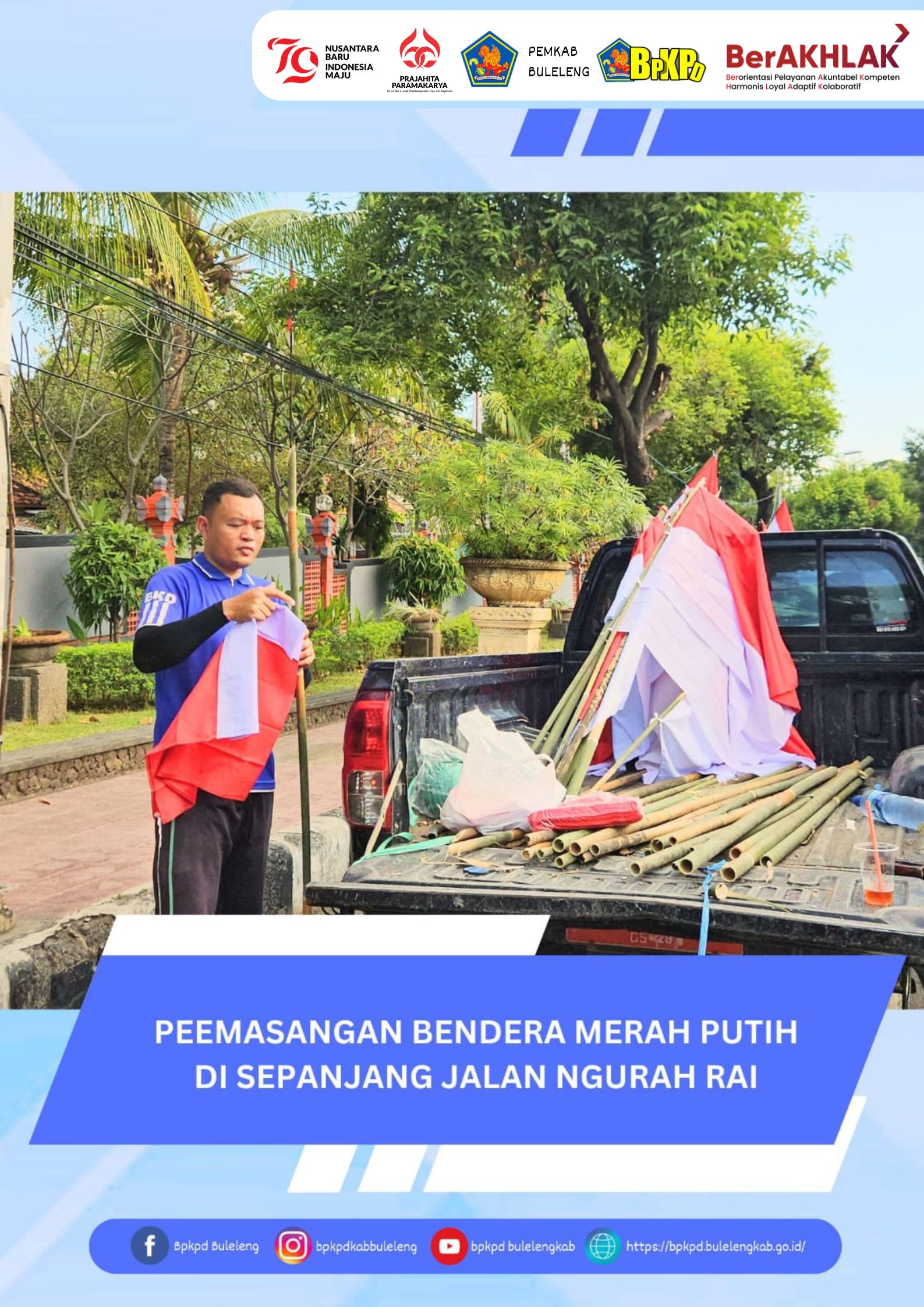 BPKPD Buleleng ikut menyemarakkan Peringatan HUT Ke-79 Kemerdekaan Indonesia. Pengibaran bendera merupakan wujud dari patriotisme dan upaya penghargaan bagi para pejuang serta kecintaan kepada negara yang harus ditunjukkan dalam bulan kemerdekaan ini. BPKPD memasang bendera yang terkumpul di fasilitas umum Taman Kota Singaraja dan mengajak masyarakat untuk bersemangat memasang bendera di berbagai titik untuk memeriahkan HUT Ke-79 Kemerdekaan
