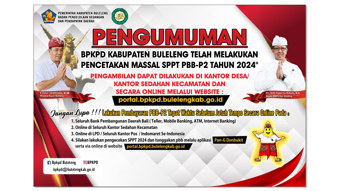 Pengumuman untuk #SemetonBuleleng, bahwa BPKPD Kab.Buleleng telah melakukan Pencetakan Massal SPPT PBB-P2 Tahun 2024.