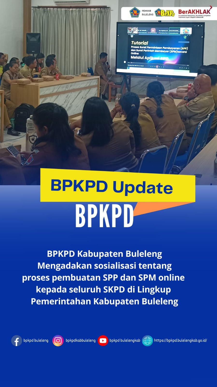 Diadakannya Bimbingan Teknis Pembuatan SPP dan SPM Online kepada Seluruh SKPD di Kab.Buleleng untuk Persiapan penerapan SP2D Online. Acara dipimpin oleh Kepala Bidang Perbendaharaan Luh Sri Mendriadi berserta seluruh SKPD yang mewakili pada hari Senin, 5 Mei 2025 bertempat di Ruang Rapat BPKPD Kab.Buleleng.