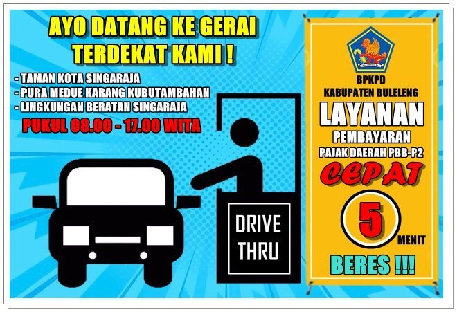 BPKPD Kab. Buleleng Hadir dengan Inovasi terbaru dengan membuka gerai DRIVE THRU yang dilaksanakan di 3 (Tiga) Tempat Kabupaten Buleleng yaitu Taman Kota Singaraja, Depan Pura Medue Karang Kec. Kubutambahan dan Lingkungan Beratan Singaraja kepada Wajib Pajak.