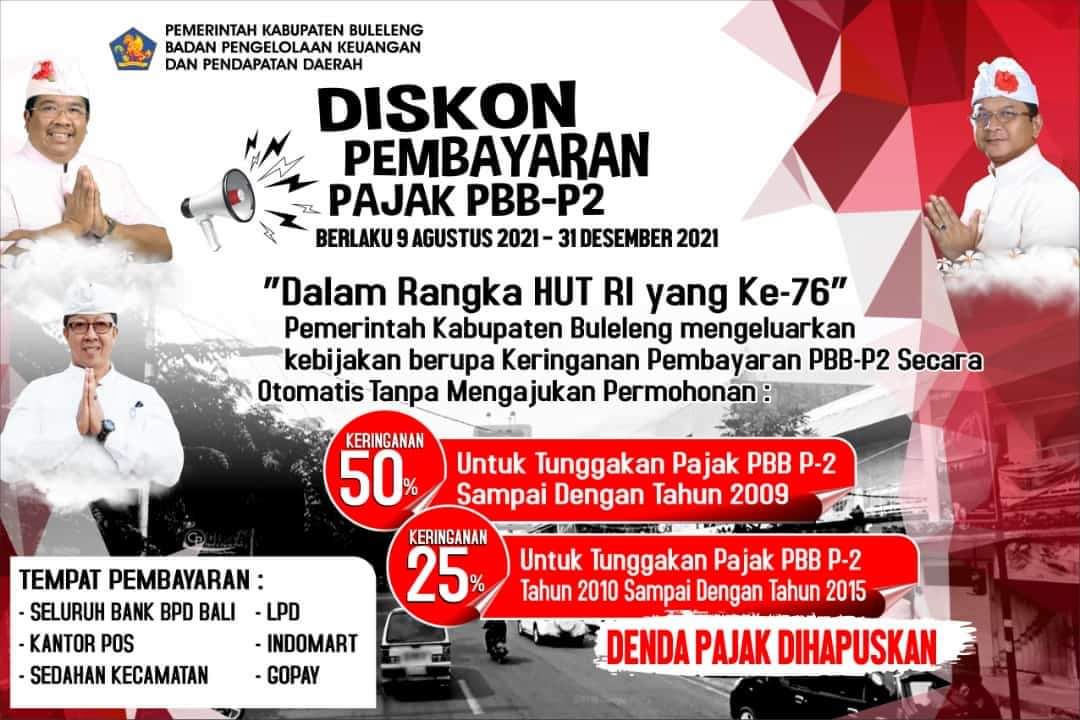 Buleleng, InfoPublik - Pemerintah Kabupaten (Pemkab) Buleleng, Bali melalui Badan Pengelolaan Keuangan dan Pendapatan Daerah (BPKPD) memberikan relaksasi pembayaran Pajak Bumi dan Bangunan-Perkotaan Perdesaan (PBB-P2) kepada wajib pajak.
