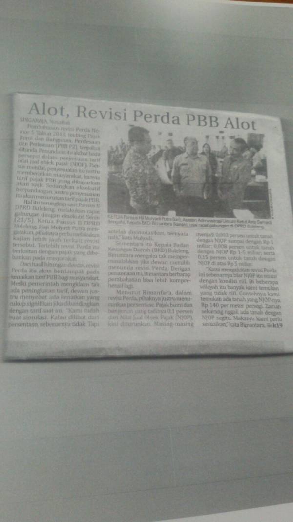 Pembahasan Revisi Perda Nomor 5 Tahun 2013 Tentang Pajak Bumi Bangunan,Perdesaan dan Perkotaan (PBB P2) ditunda akibat beda persepsi dalam penyesuaian tarif Nilai Jual Objek Pajak (NJOP) antara Pansus menilai, penyesuaian itu justru memberatkan masyarakat sedangkan eksekutif berpandangan, Justru penyesuaian itu akan menurunkan tarif pajak PBB. 22/05