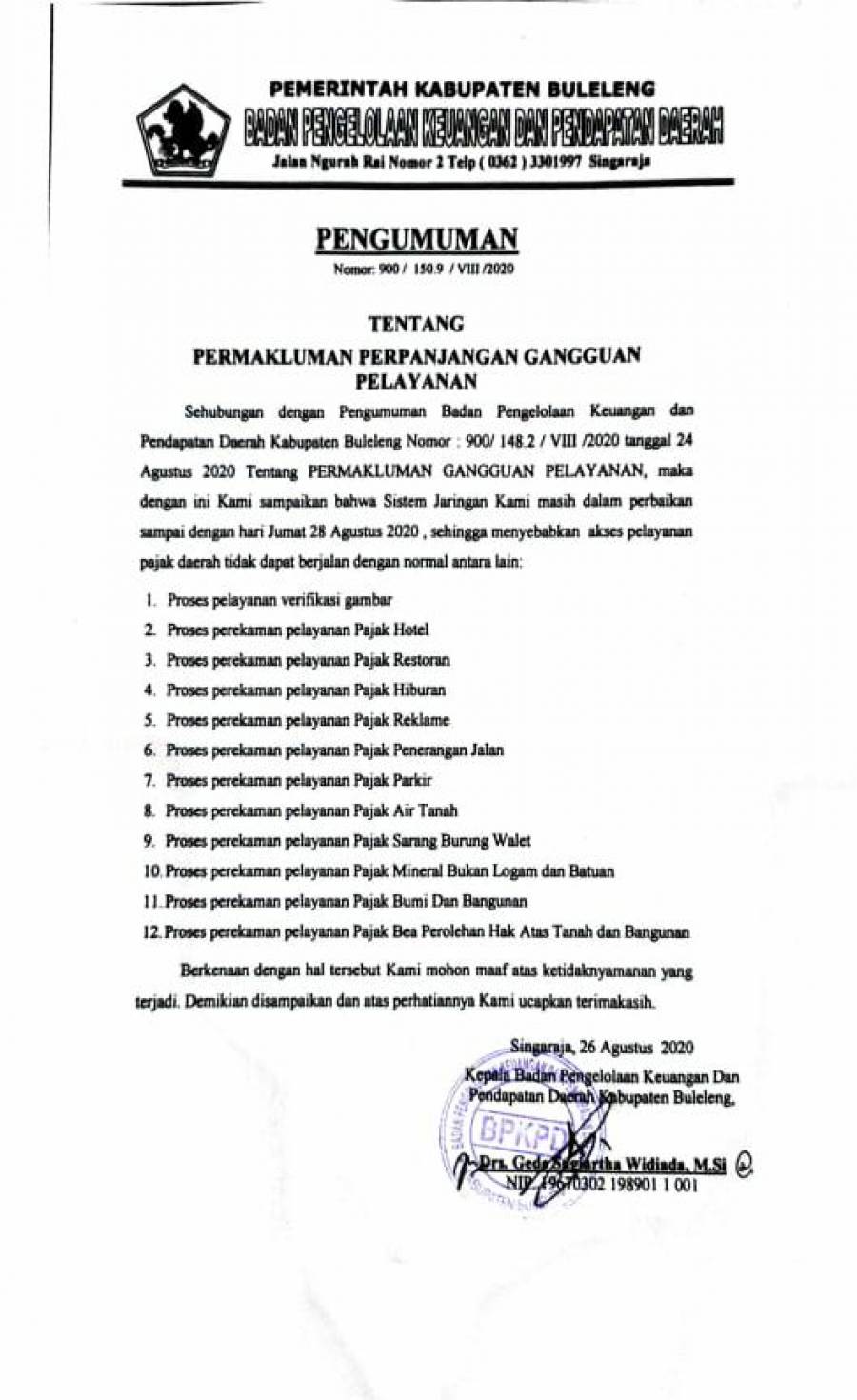 Diinformasikan kepada seluruh Masyarakat Kab. Buleleng bahwa pada hari senin, 24 Agustus 2020 s/d Jumat 28 Agustus 2020 Sesuai data teralmpir. Kami mohon maaf terkait hal tersebut dan Terimakasih atas perhatiannya.