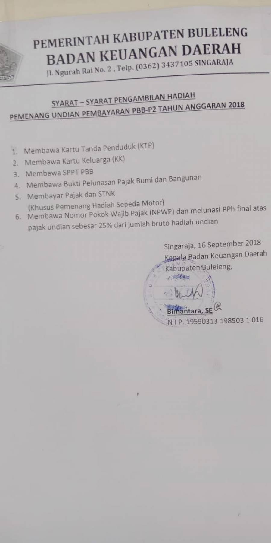 SYARAT- SYARAT PENGAMBILAN HADIAH UNDIAN GEBYAR PAJAK BUMI BANGUNAN PEDESAAN DAN PERKOTAAN SERTA SEKTOR PERIKANAN TAHUN 2018 ADALAH