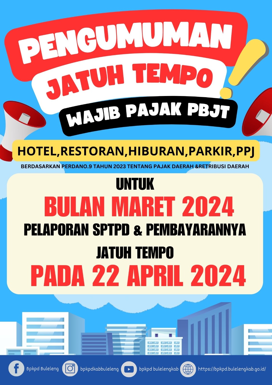 Pengumuman untuk Tanggal ''JATUH TEMPO'' untuk Bulan Maret Tahun 2024, tentang Pelaporan SPTPD dan Pembayaran Pajak Daerah.